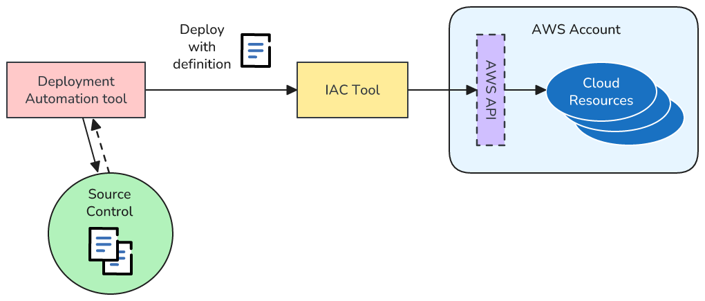 - Define a workflow in our deployment automation tool that will read the definition from Source Control, and then invoke our IaC tool