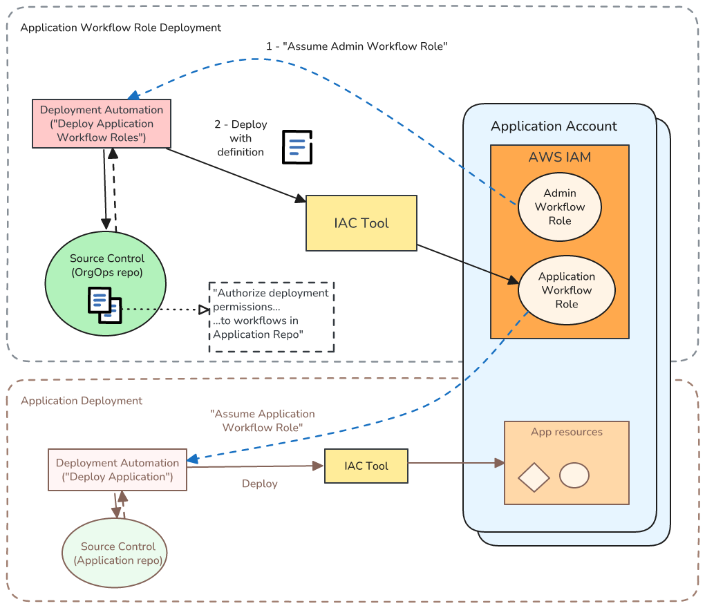 Once this workflow is successful we can create workflows associated with our application repo, and those workflows will only have scope to deploy to the application accounts, with the permissions we specified in the role definition. These workflows are represented by the lower Application Deployment part of the diagram.
