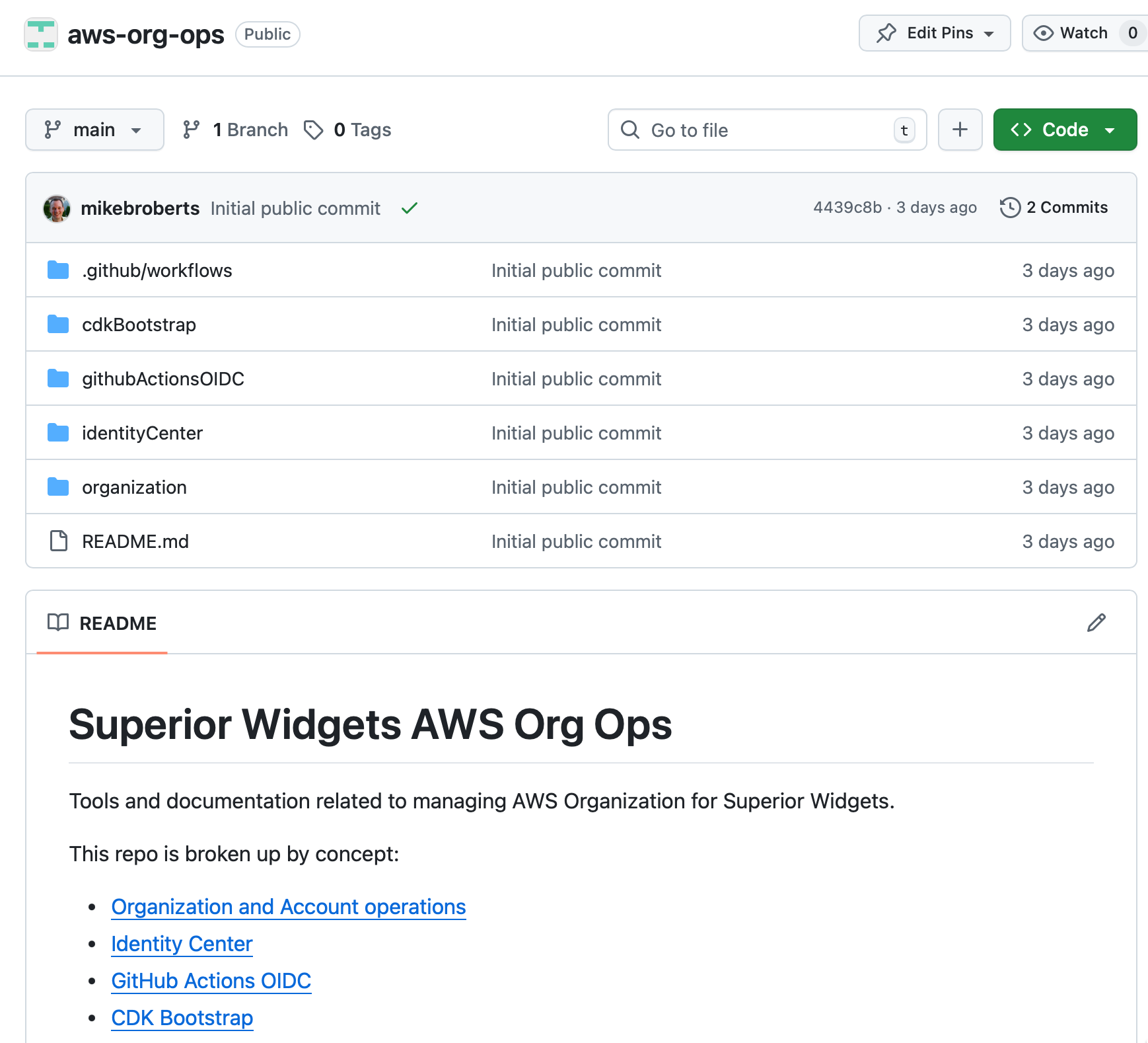 I’ve created an example AWS Organization called “Superior Widgets” for this article series. I store all the IaC for this in the (public!) GitHub repo here, named aws-org-ops. You can use this repo if you want for inspiration for your own Org Ops work!